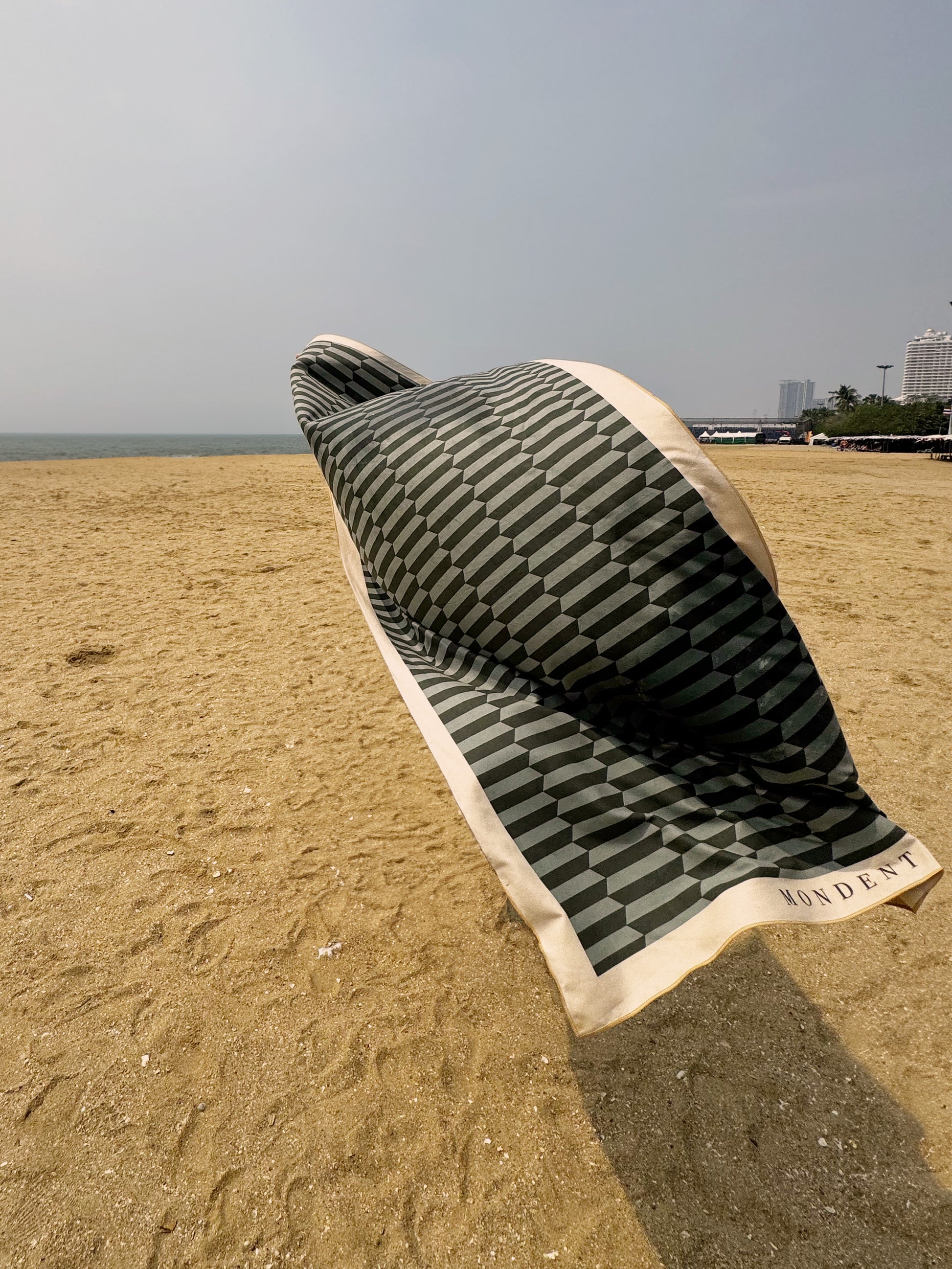 Green Fluted er et elegant og funksjonelt strandhåndkle med et mønster inspirert av Rolex Datejust Fluted Motif Dial. De subtile, geometriske linjene skaper et eksklusivt uttrykk. Håndkleet er lett, tørker raskt og holder sanden unna – perfekt for strand, båt eller reise. Laget av resirkulerte materialer for en bærekraftig og sofistikert opplevelse.